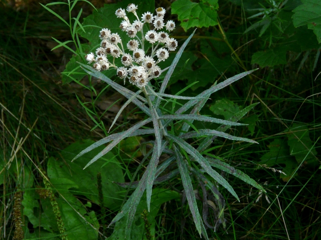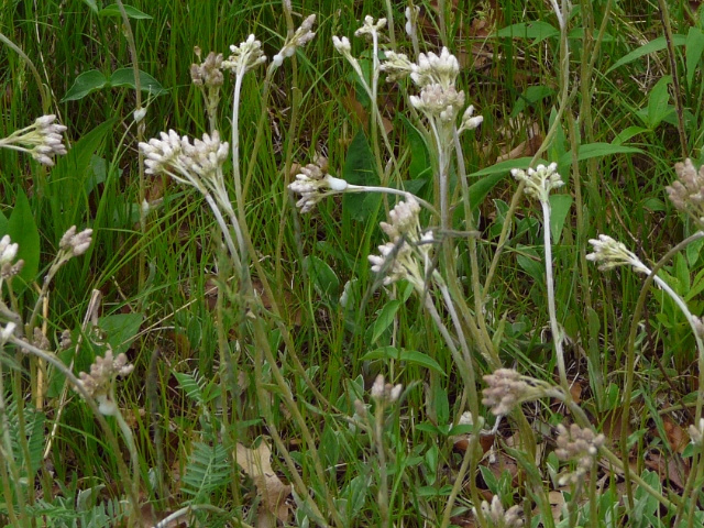 Pearly Everlasting - flower head approx. 1 cm - flower cluster to 15 cm - leaves 4 to 12 cm - height to 90 cm - High Park - August 2010