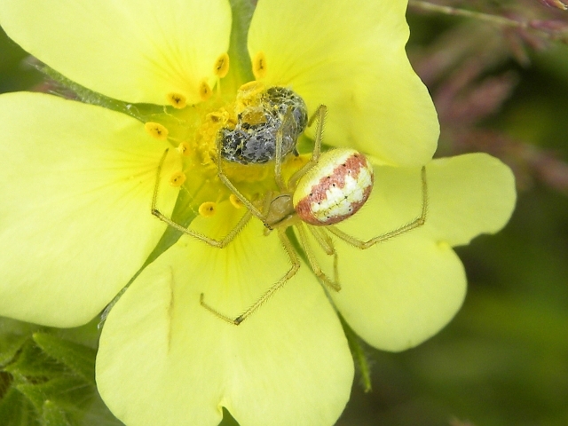 Comb-footed Spider with prey - approx. 1 cm body - Lower Don Valley (Crother's Woods) - July 2009