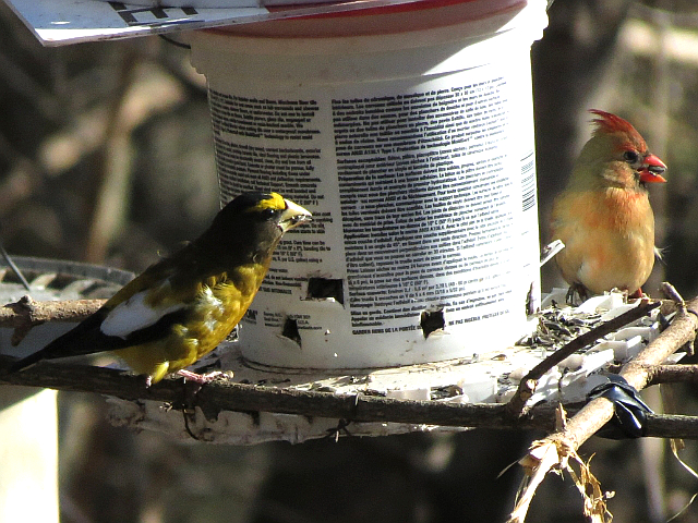 Evening Grosbeak (male) with female Cardinal - approx. 18 cm - High Park - January 2015