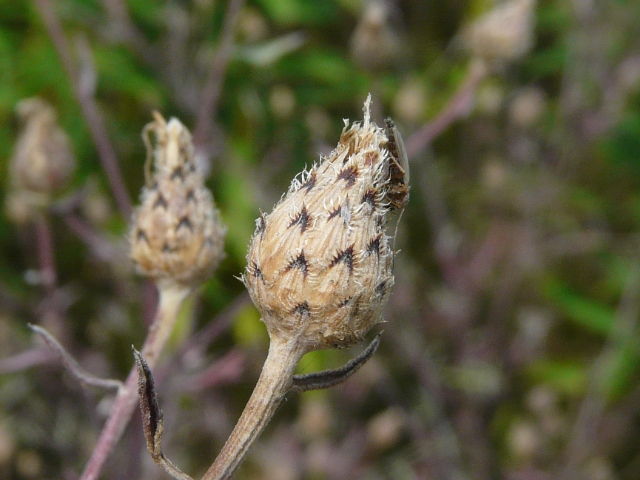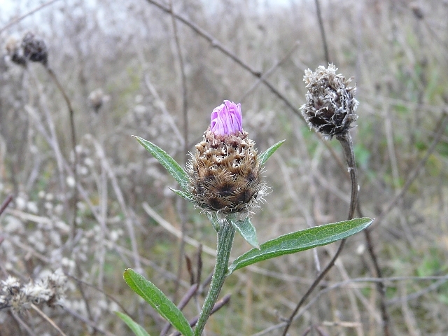 Spotted Knapweed - flower head to 2.5 cm - leaves 10 to 25 cm (basal), smaller (stem) - height to 1.2 m - Samuel Smith Park - November 2009