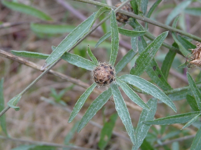 Spotted Knapweed - flower head to 2.5 cm - leaves 10 to 25 cm (basal), smaller (stem) - height to 1.2 m - Leslie Spit - August 2011