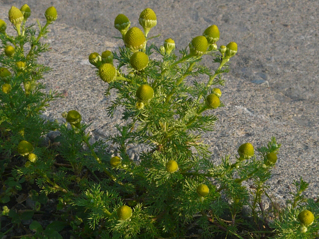 Pineapple Weed - flower head 5 to 10 mm - leaves to 5 cm - height to 40 cm - Lower Don Valley (Brickworks) - June 2009