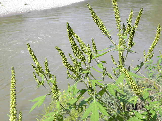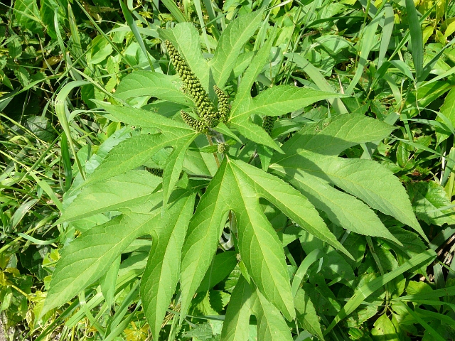 Giant Ragweed - flower head approx. 5 mm - raceme to 25 cm - leaves to 20 cm - height to 4.5 m - Lower Don Valley (Leaside) - July 2010