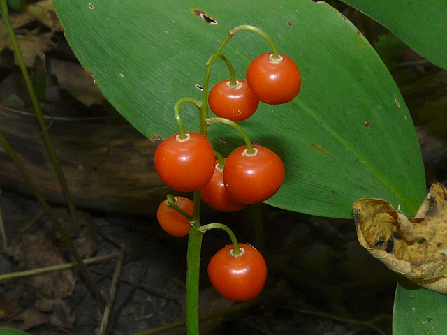 Lily-of-the-Valley - flower 6 to 9 mm - raceme to 15 cm - fruit approx. 1 cm - leaves to 20 cm - height to 30 cm - Rouge Park - October 2015