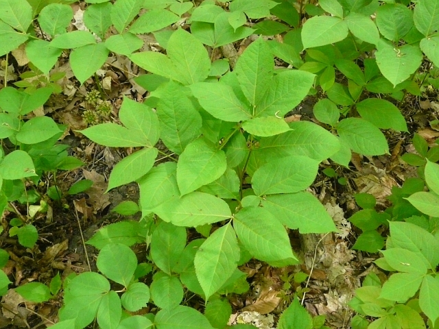 Wild Sarsaparilla - umbel 3 to 5 cm - leaflet 10 to 15 cm - height to 60 cm - West Don Valley (E.T. Seton Park) - May 2011