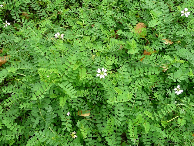 Crown Vetch - flower 1 to 1.5 cm - flower head to 2.5 cm - fruit 2 to 5 cm - leaves approx. 11 to 21 leaflets 1.5 to 2 cm - vine to 50 cm - Guildwood Park - October 2010