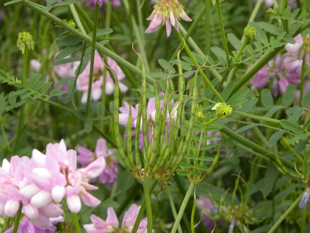Crown Vetch - flower 1 to 1.5 cm - flower head to 2.5 cm - fruit 2 to 5 cm - leaves approx. 11 to 21 leaflets 1.5 to 2 cm - vine to 50 cm - Guildwood Park - September 2010