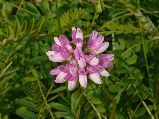 Crown Vetch - flower 1 to 1.5 cm - flower head to 2.5 cm - fruit 2 to 5 cm - leaves approx. 11 to 21 leaflets 1.5 to 2 cm - vine to 50 cm - Lower Don Valley (Leaside) - June 2010