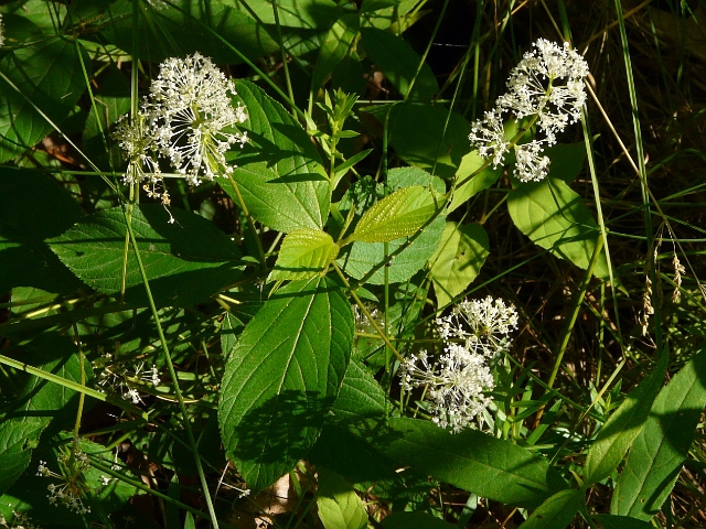 New Jersey Tea - flower approx. 5 mm wide on long stalk - cluster to 5 cm - fruit approx. 7 mm - leaves to 10 cm - height to 1.2 m - High Park - July 2011