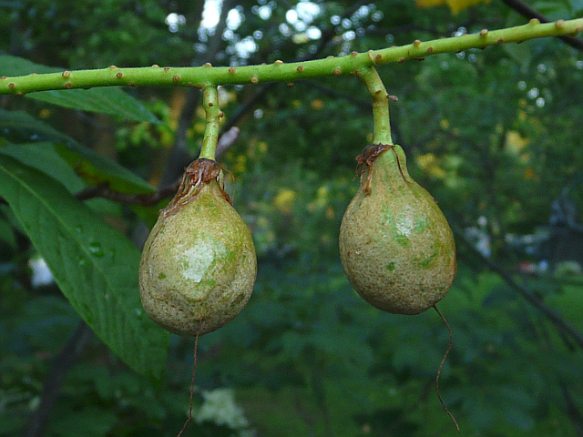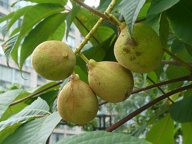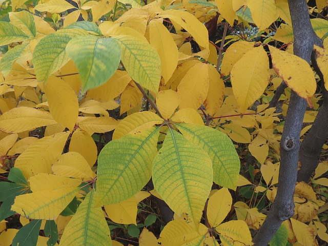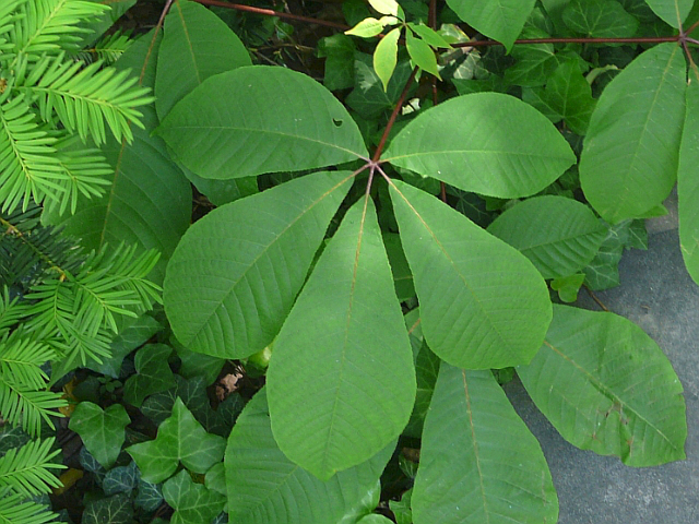 Bottlebrush Buckeye - flower 3 to 4 cm with protruding stamens - panicle to 30 cm - fruit approx. 2.5 cm - leaflet 10 to 20 cm - height to 5 m - Mount Pleasant Cemetery - October 2015