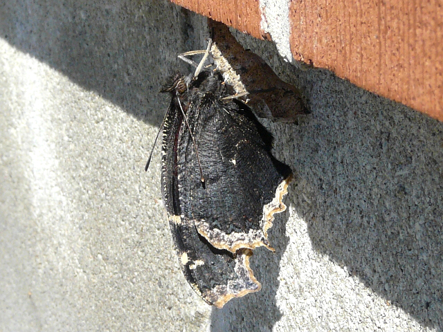 Mourning Cloak Butterfly emerged from pupa - wingspan approx. 7 cm - Don Mills - June 2015