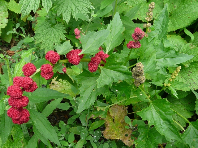 Strawberry-blite - flower 2 to 3 mm - spherical spike approx. 1 cm - leaves to 10 cm (decreasing with height) - height to 60 cm - Lower Don Valley (Crother's Woods) - July 2010