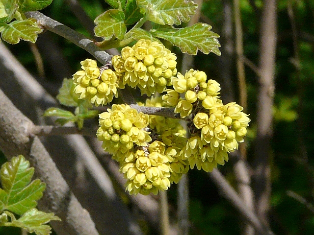 Fragrant Sumac - flower approx. 3 mm - fruit approx. 7 mm - leaflet to 5 cm - compound leaf to 10 cm - height to 2 m - Samuel Smith Park - May 2012
