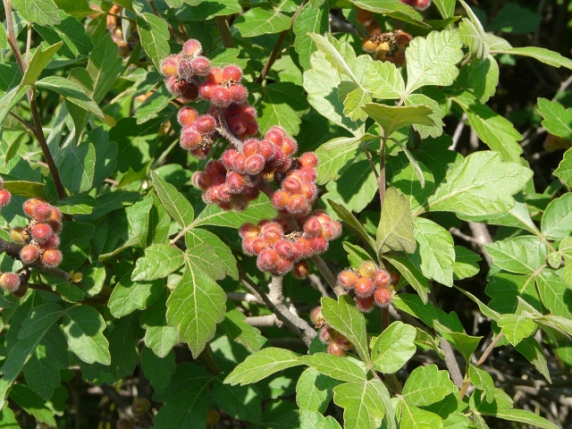 Fragrant Sumac - flower approx. 3 mm - fruit approx. 7 mm - leaflet to 5 cm - compound leaf to 10 cm - height to 2 m - Ashbridge's Bay - July 2010
