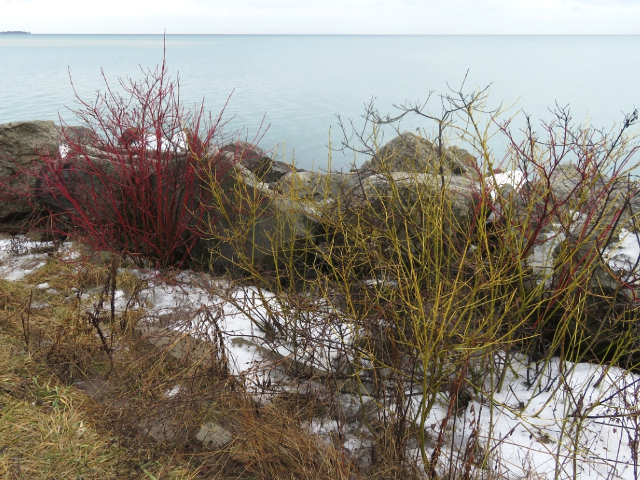 Red-osier Dogwood (Golden-twig cultivar) - flower approx. 1 cm - fruit approx. 1 cm - leaves 5 to 12 cm - height to 4 m - Humber Bay Park - February 2018