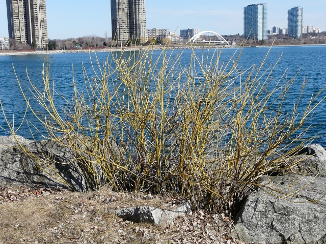 Red-osier Dogwood (Golden-twig cultivar) - flower approx. 1 cm - fruit approx. 1 cm - leaves 5 to 12 cm - height to 4 m - Humber Bay Park - April 2011