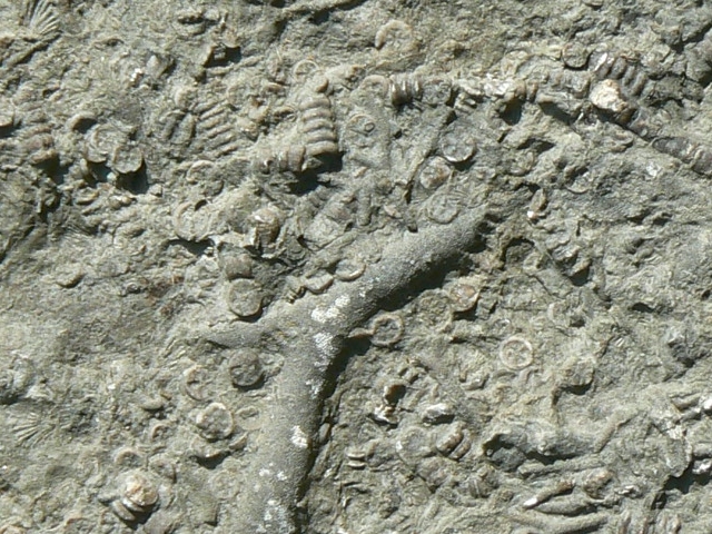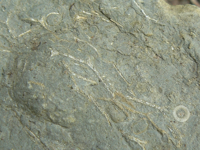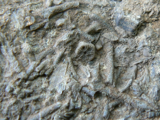 Crinoids, Brachiopods and Bryozoa - largest feature approx. 5 cm - Lower Don Valley (Brickworks) - August 2007